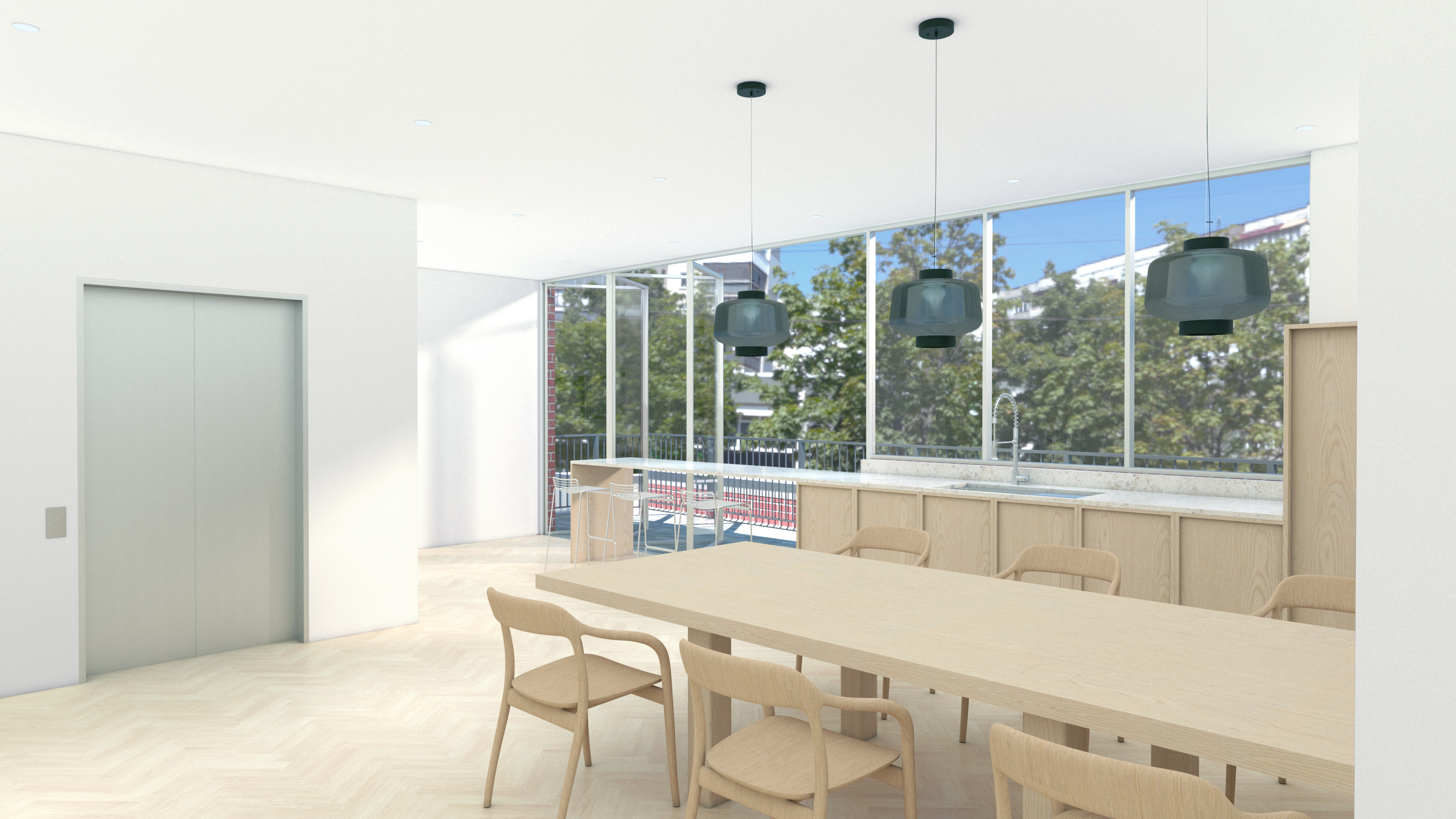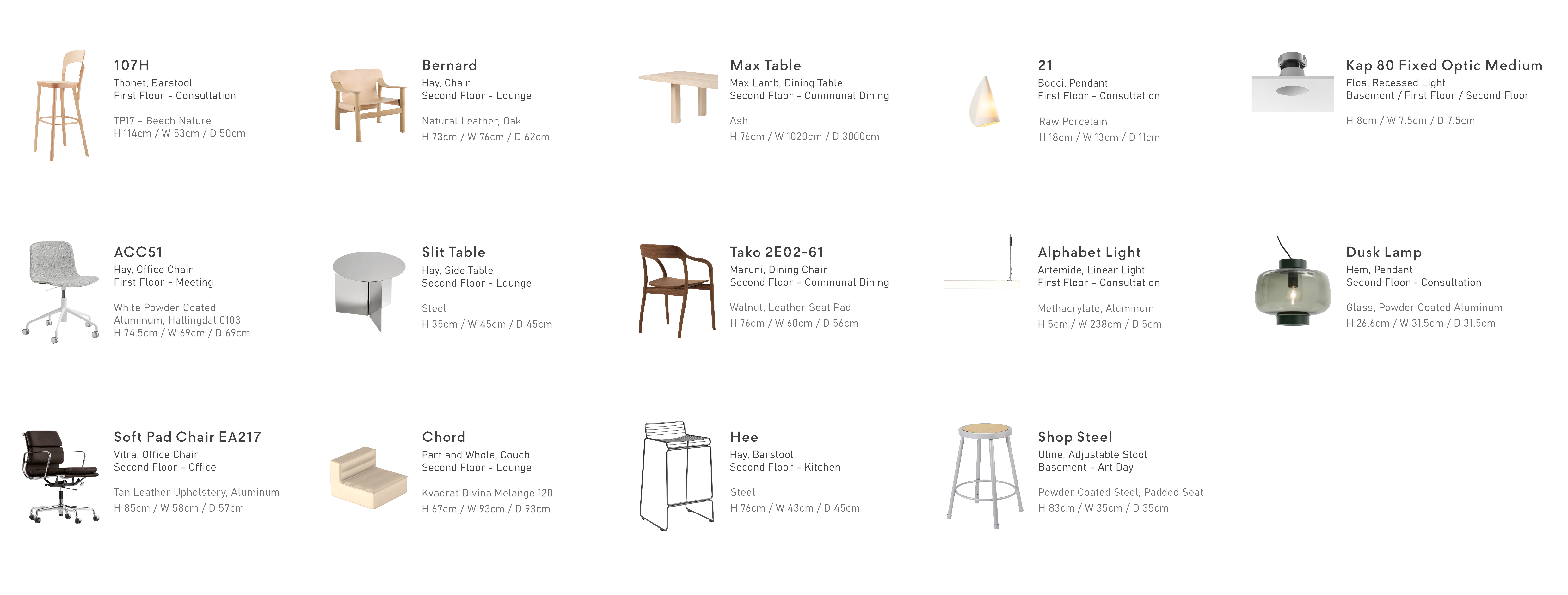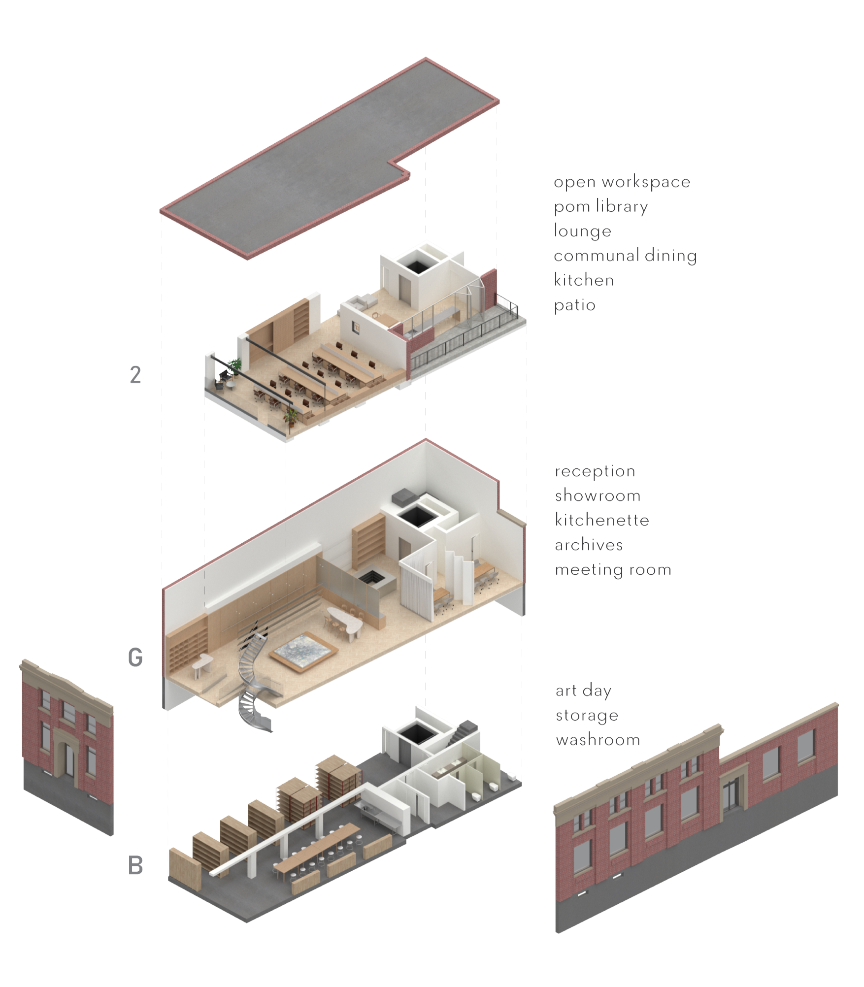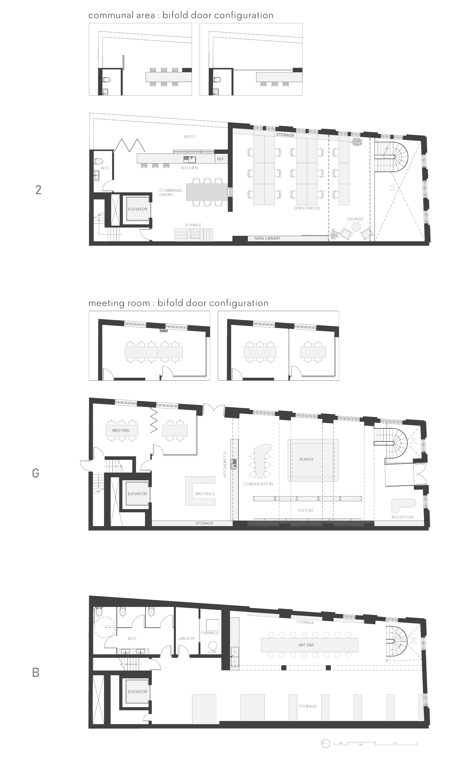 The first floor features the showroom, meeting rooms, and archive storage. The second floor is dedicated to employee workspaces and includes a kitchen and break room. The basement primarily serves as storage and also includes a designated area for ‘Art Day.’