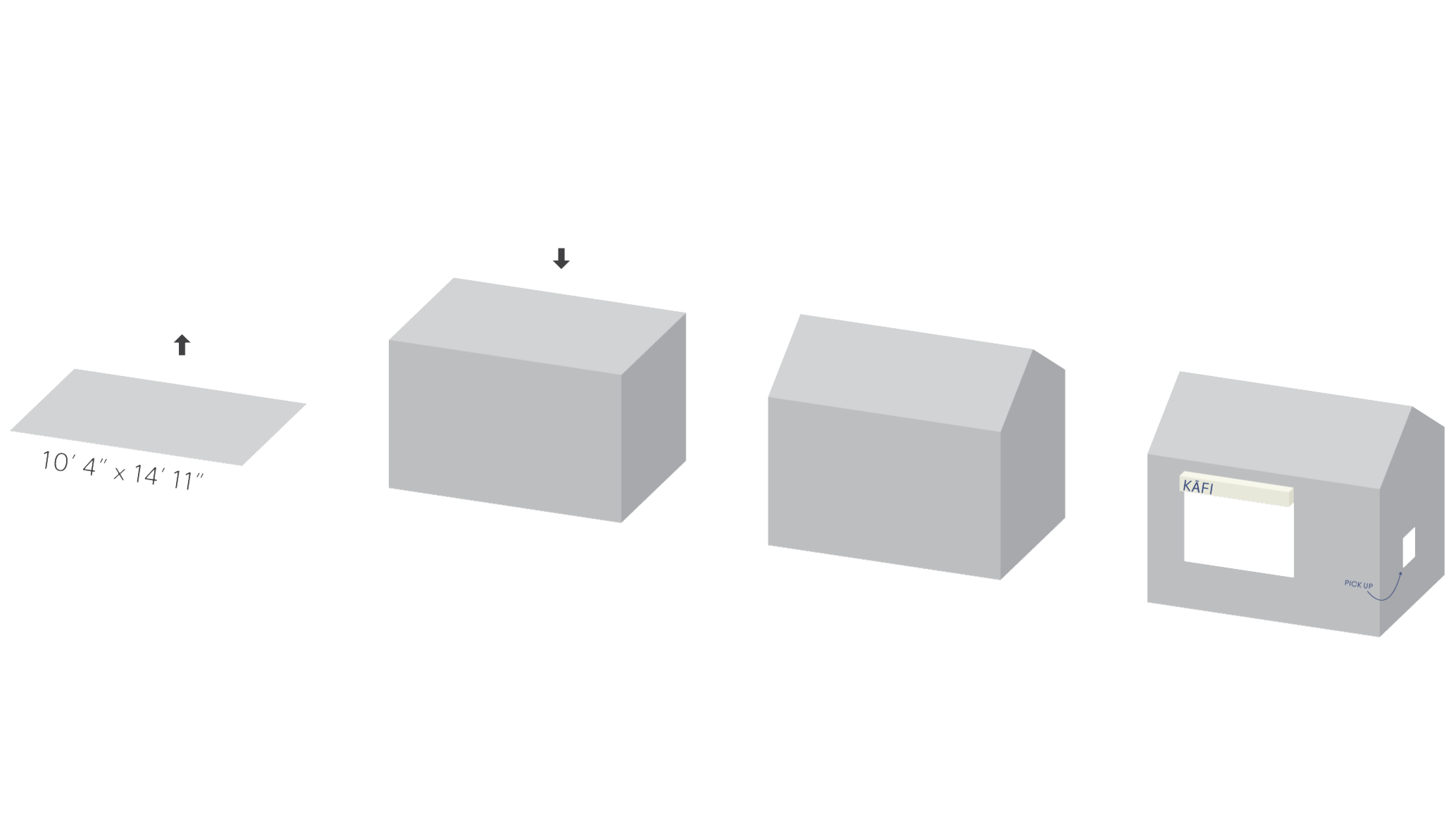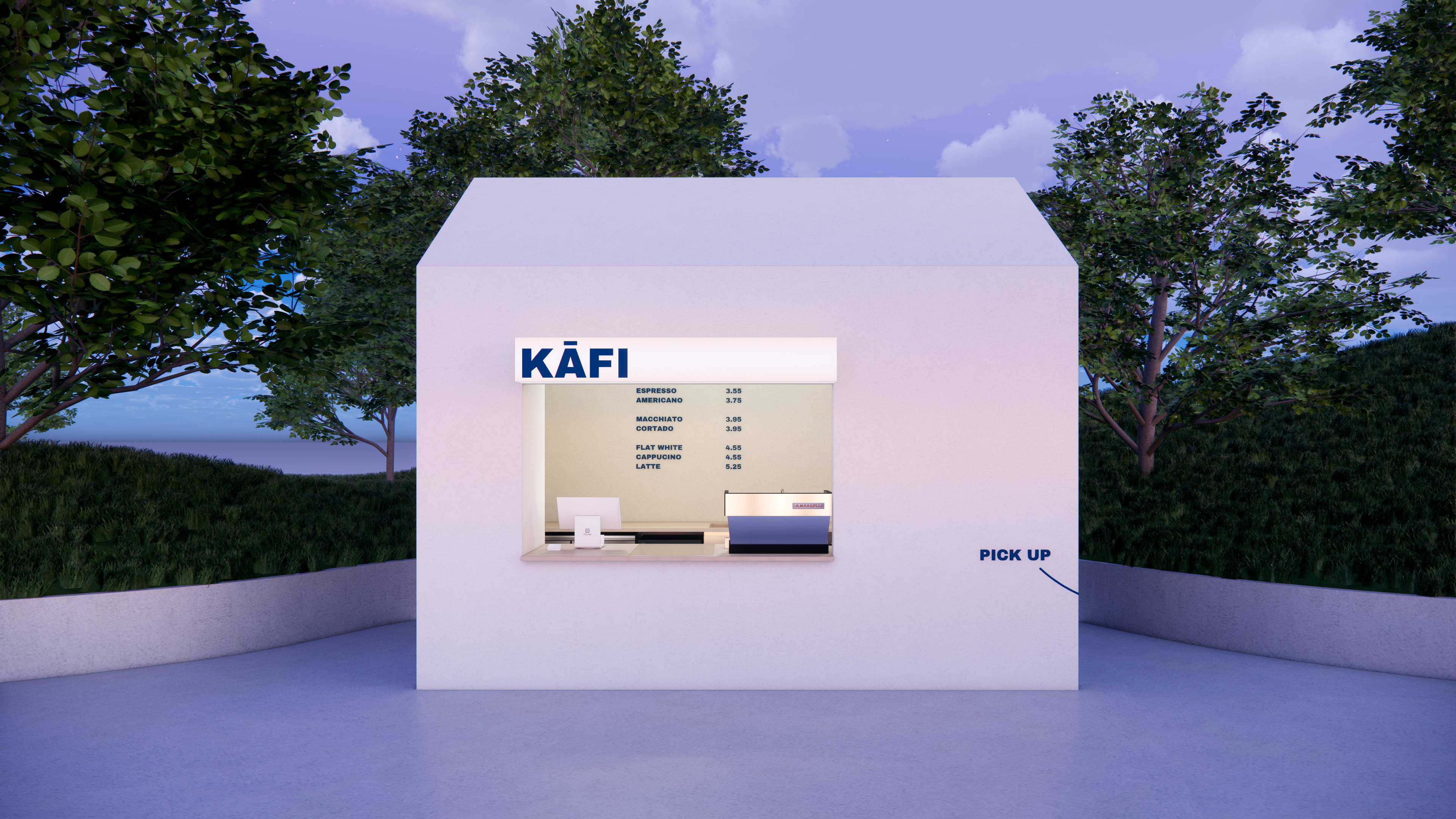 Its exterior features a minimalist design that cleverly mimics the shape of a milk carton, enhanced by a bold typeface that prominently displays the café’s name and offerings. Text is strategically employed to showcase the menu items, prices, and pickup point.