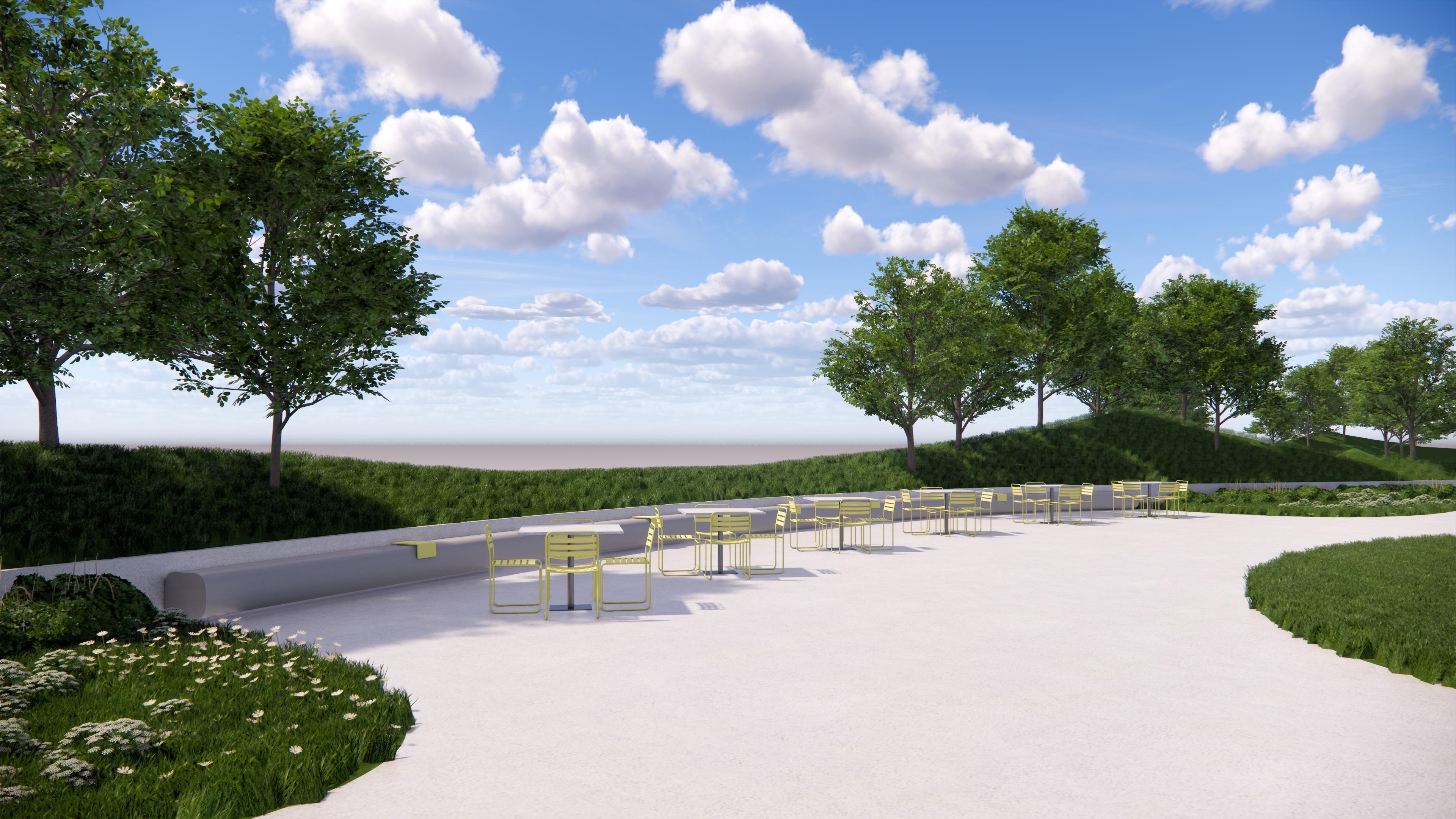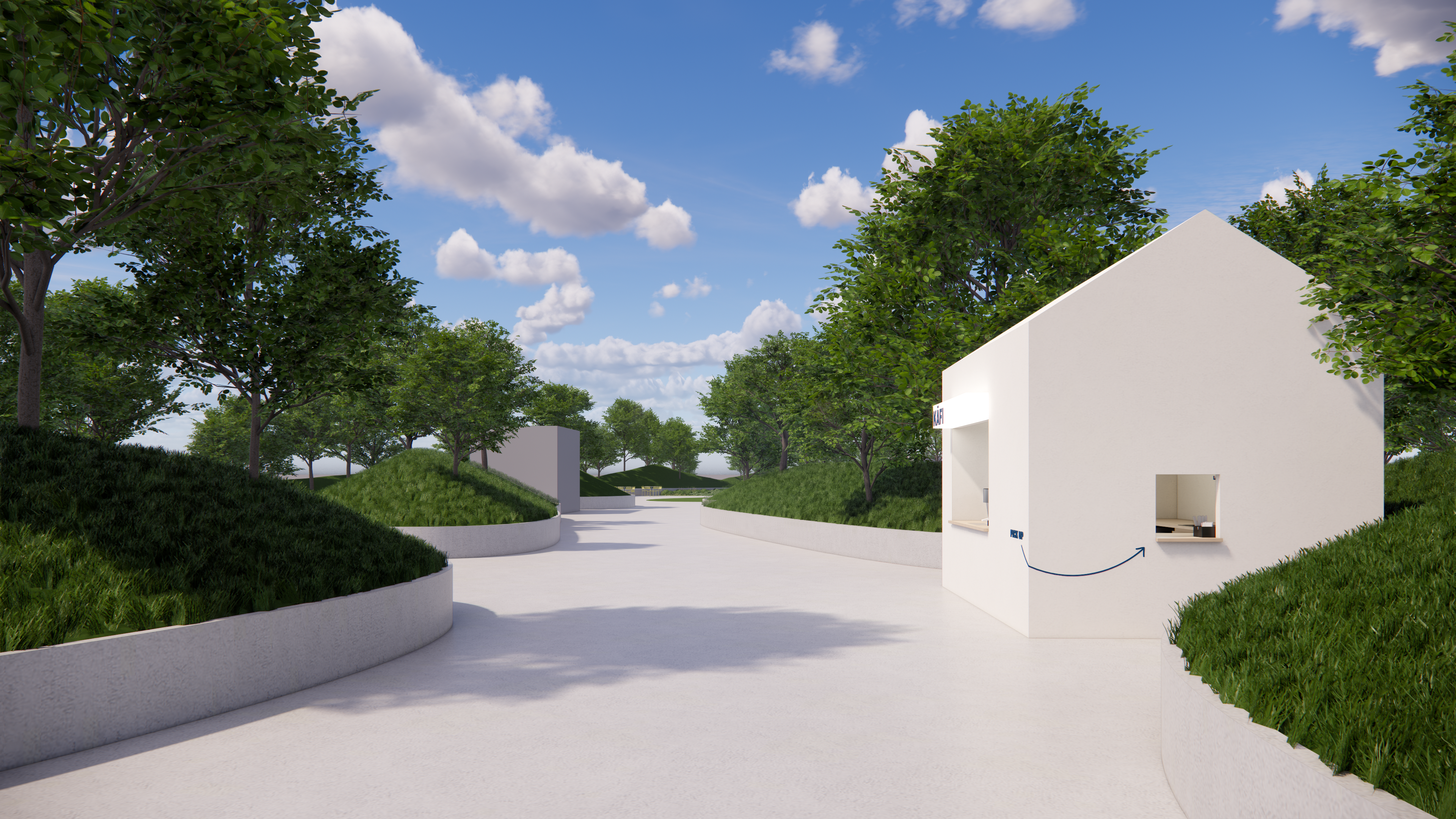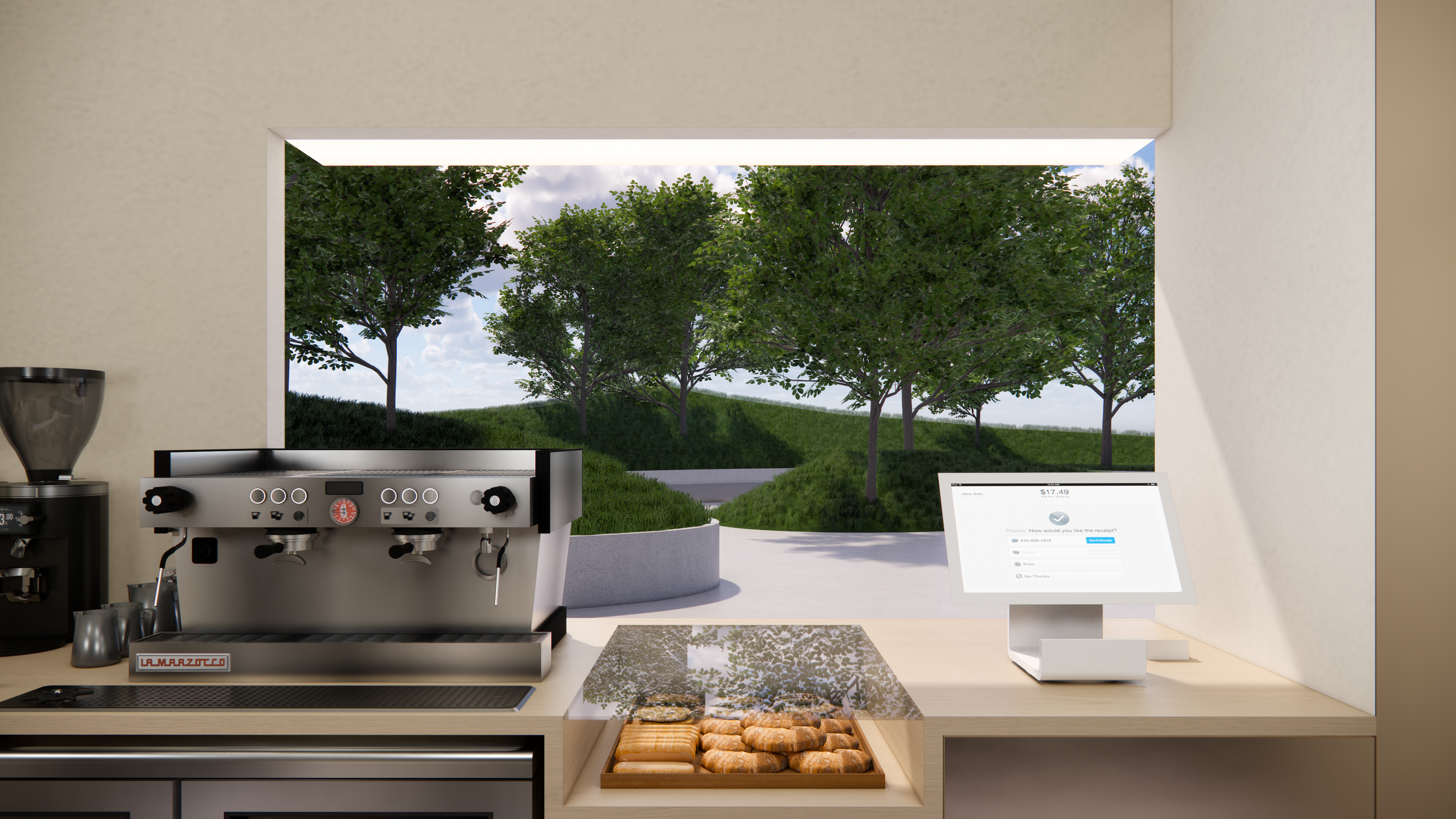 A small coffee shop nestled in a public park, serving coffee-to-go and freshly baked goods.