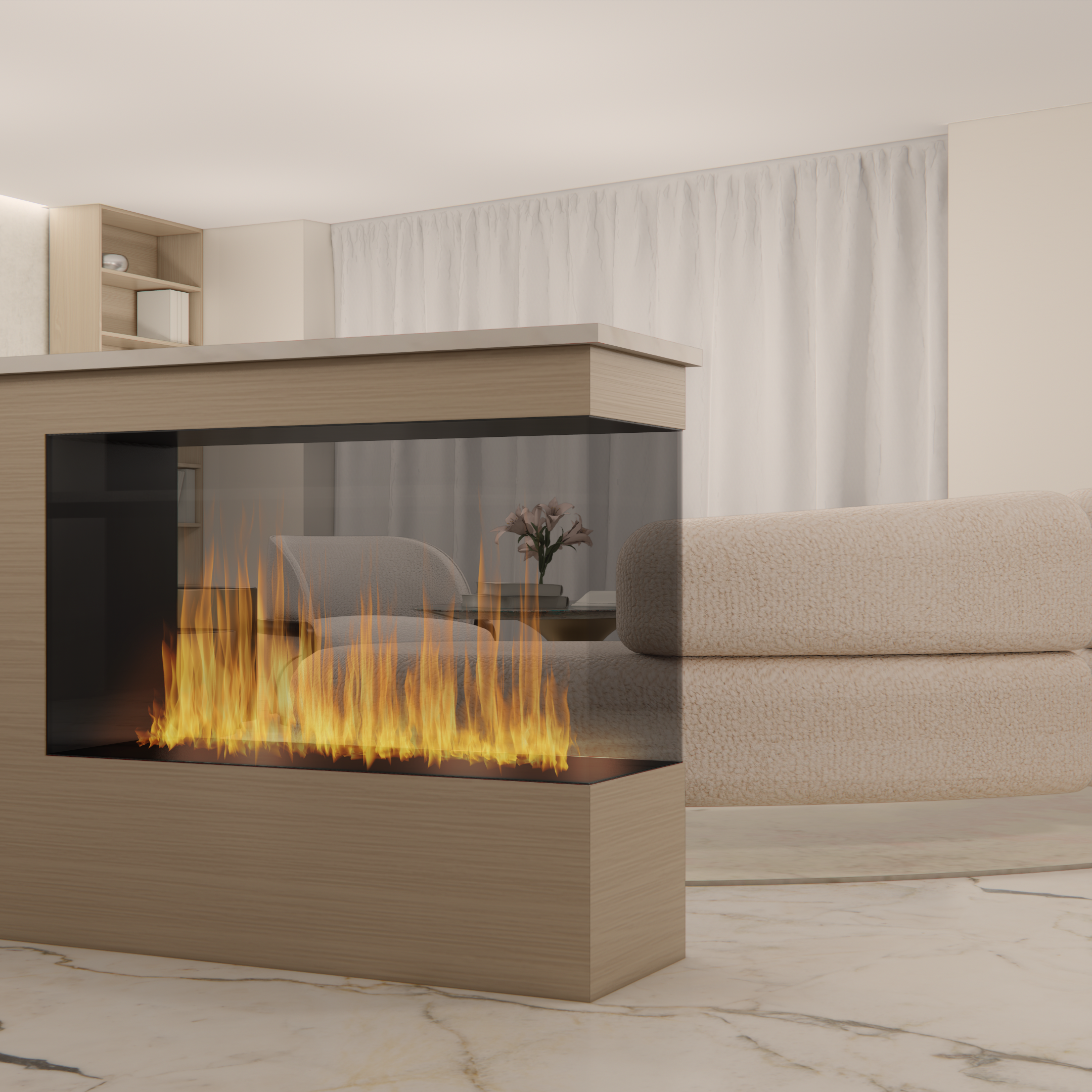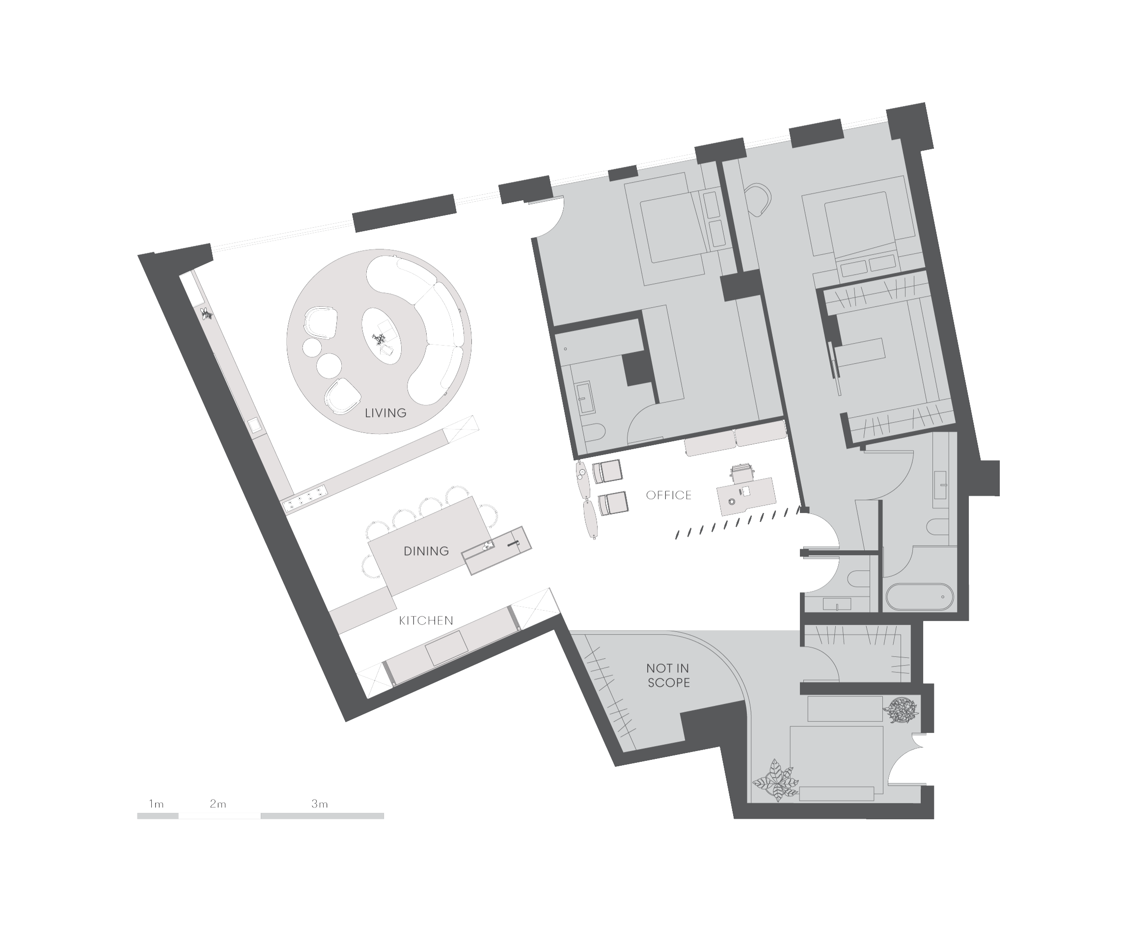The design addresses the unit's low ceilings and angular walls with thoughtful consideration. It features a bespoke dining table and an innovative kitchen countertop system, complemented by bifold kitchen cabinet doors. In response to the client's request, the design maintains a neutral and simple aesthetic.